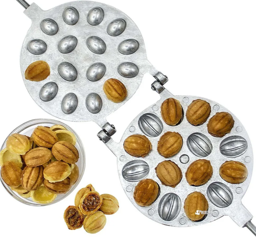 -8- Готовые румяные половинки печенья выньте из орешницы. И загрузите следующую партию. |
