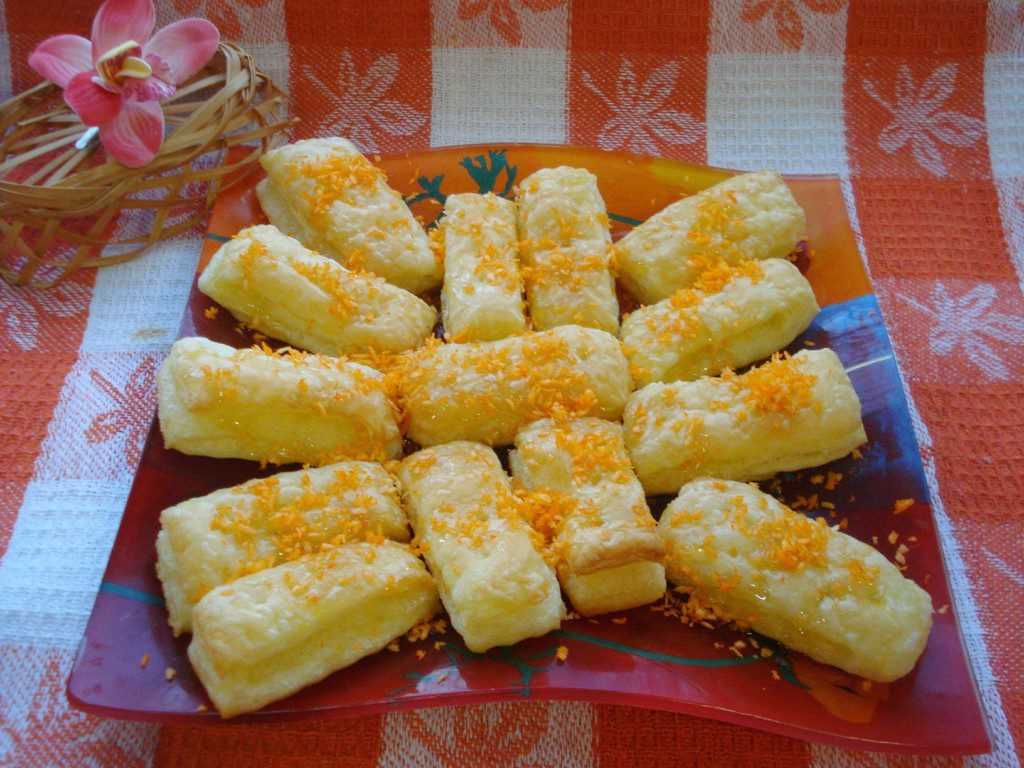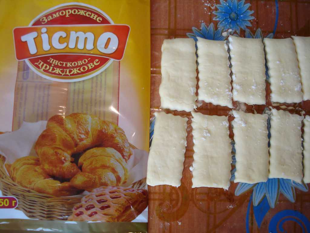 Пласт готового слоеного дрожжевого теста разрезать, фигурным ножом, на прямоугольники, как показано на фото.