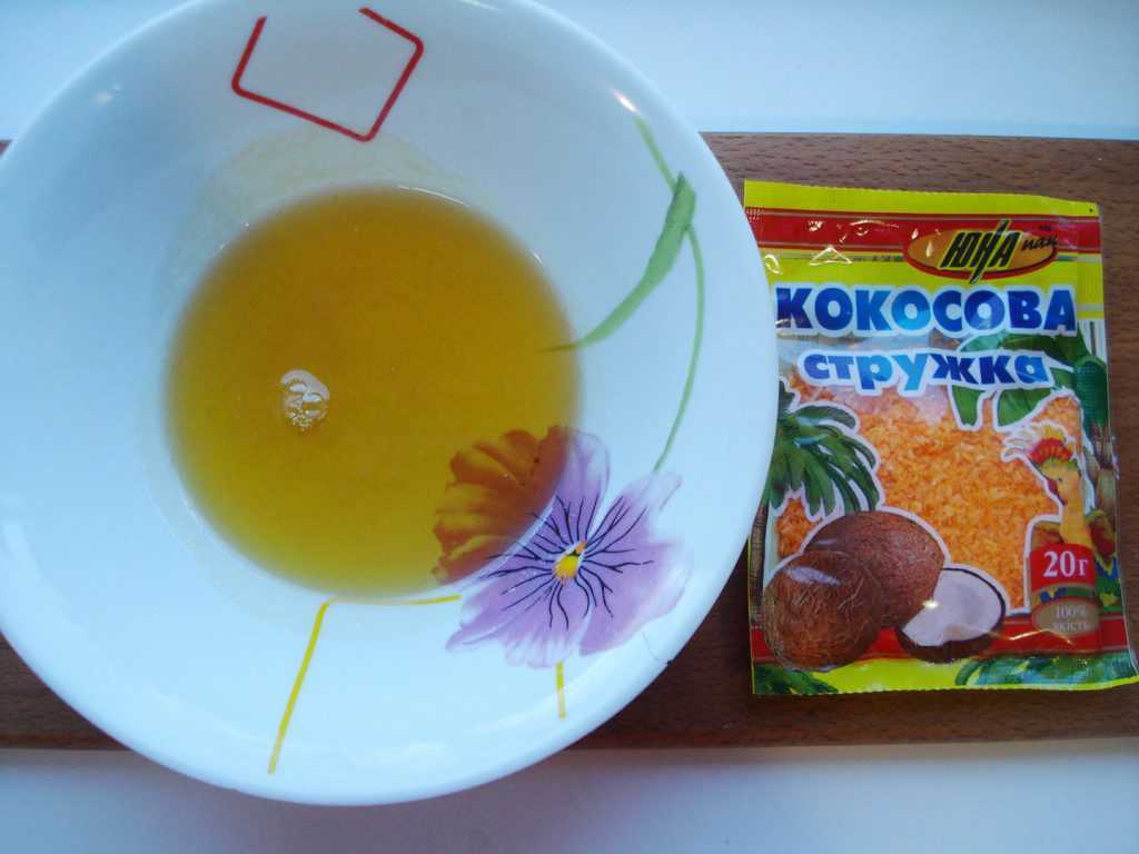 Теперь, самое время приготовить мед жидкой консистенции и кокосовую стружку. У меня мед был засахаренный, поэтому я отправила его в микроволновку на 20 секунд. За это время он приобрел необходимую консистенцию.
