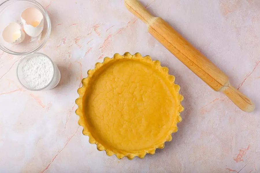 Большую часть теста распределяем равномерно по дну круглой формы или противня, формируя при этом бортики. Остальное тесто используйте для украшения. Если вы хотите сделать полностью открытый пирог, используйте все тесто для основы.