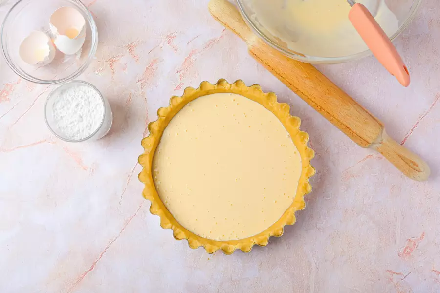 Шаг 5В глубокой миске взбейте яйцо со сметаной и оставшимся сахаром. Получившуюся смесь влейте в песочную основу и разровняйте поверхность ложкой или лопаткой.