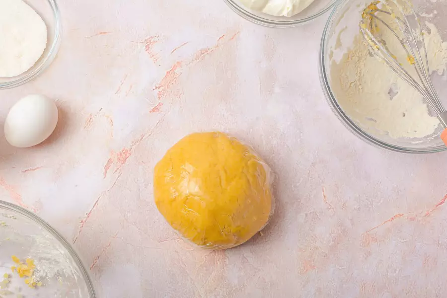 - Сформируйте тесто в шарик, оберните в пищевую пленку и поместите в холодильник на один час.
