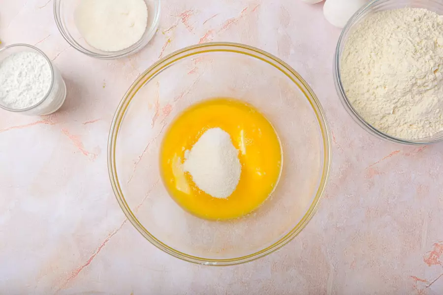 - Теперь приступим к сухим ингредиентам. Смешиваем просеянную муку, разрыхлитель, крахмал и соль. Небольшими порциями вводим эту смесь к масляно-яичной.