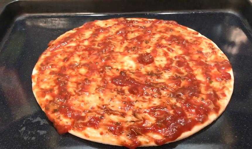 - На подготовленную основу выложить соус и равномерно распределить его по всей поверхности.