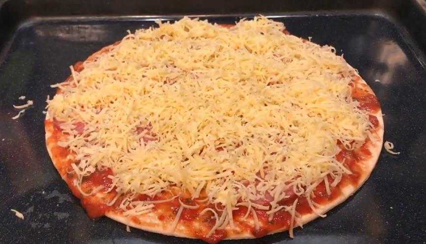 - Распределить томатный соус по поверхности лепешки, притрусить натертой моцареллой. Поверх сыра равномерно выложить колбасные кольца. Поставить форму для запекания на 7 минут в духовой шкаф при температуре 230˚.