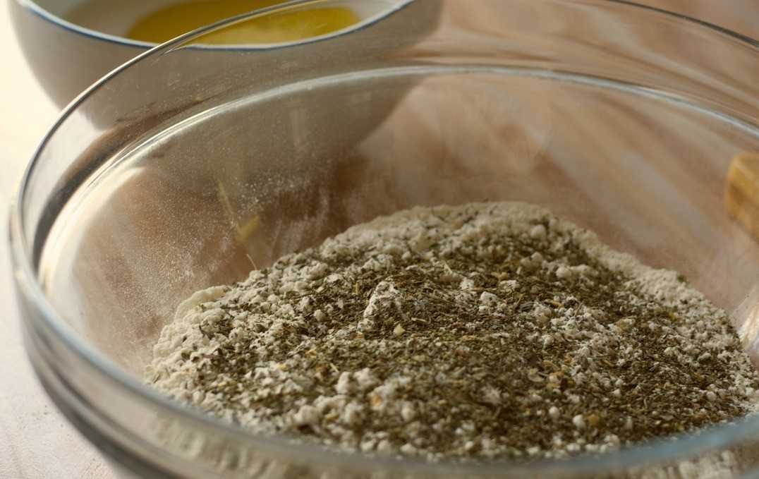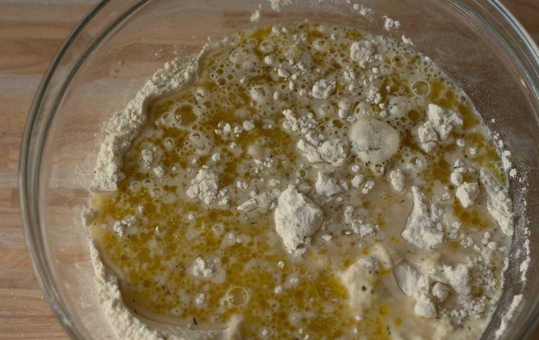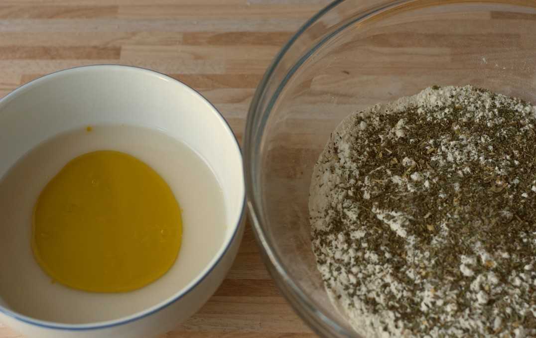 - Сначала смешиваем все жидкие ингредиенты: молоко, воду, яйцо, растительное масло, яблочный уксус. Затем добавляем соль, соду, орегано, снова перемешиваем. Всыпаем муку грубого помола, замешиваем тесто.