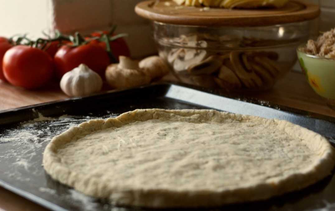 - Разогреваем духовку до 200 градусов, режим «верх-низ». Рабочую поверхность слегка припыляем мукой, тесто раскатываем скалкой в тонкий пласт нужного диаметра.