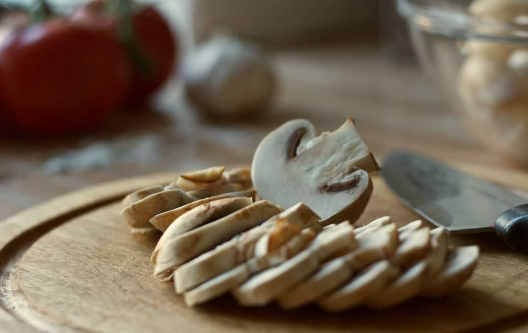 Пока тесто подходит, можно заняться начинкой. Порезать грибы пластинками, помидоры — кружочками.