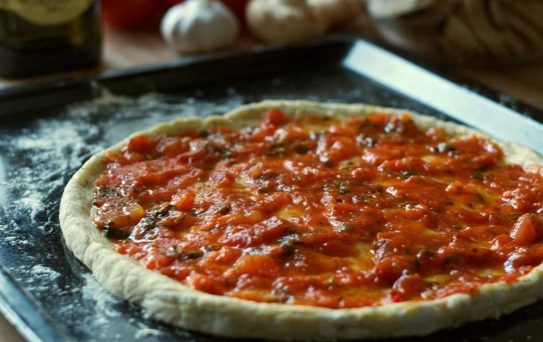 - тесто выкладывается в форму, покрывается слоем томатной пасты;
