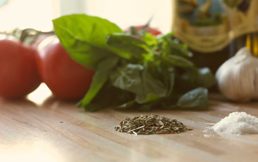 Распределить по поверхности маринованные опята. Следом разложить кружочки помидоров. Присыпать томаты сухими травами.