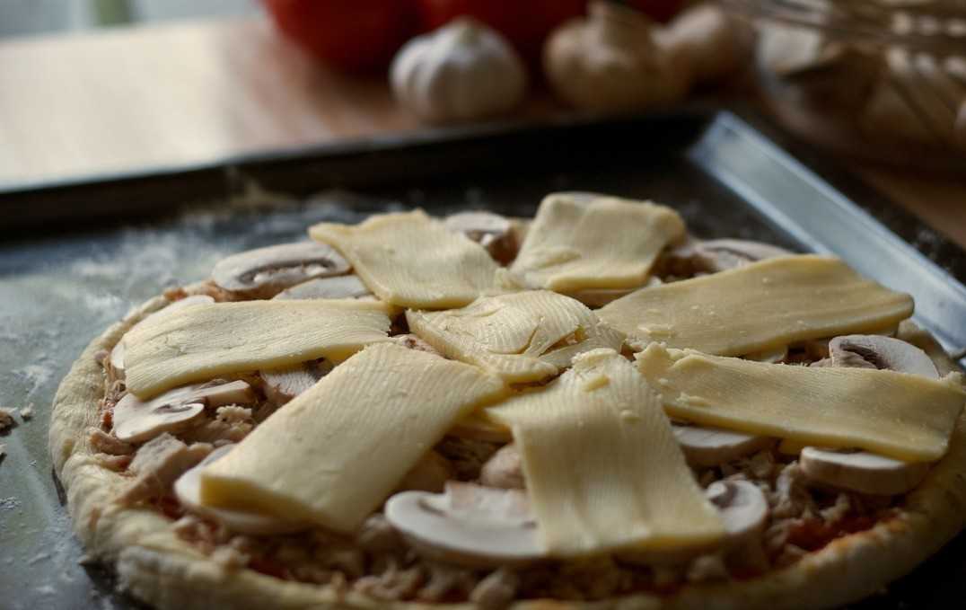 - Расправить тесто на противне тонким слоем, выложить первым слоем сыр с яйцами, вторым — огурцы с сардельками, третьим — помидор, четвертым — индейку и перец, сверху засыпать оставшимся мелко натертым сыром.