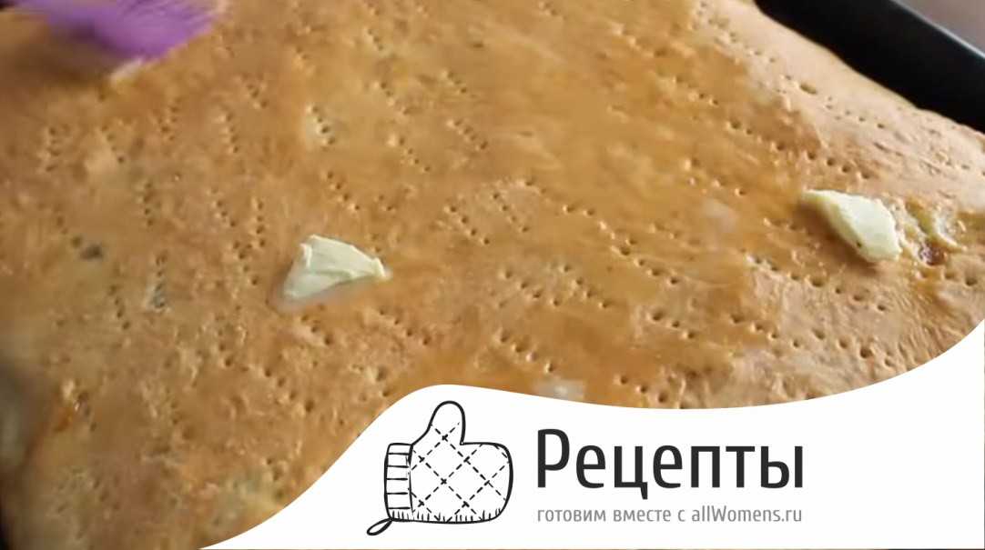 - Затем растопите сливочное масло и равномерно полейте им начинку пирога.