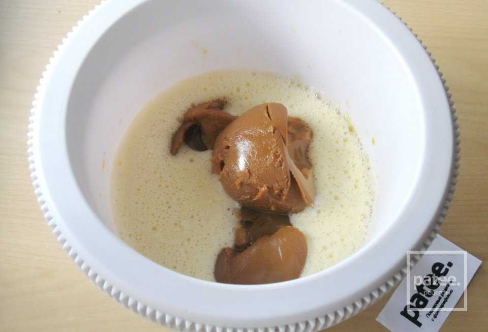 К 2/3 части вареной сгущенки добавить яйца и взбить миксером.