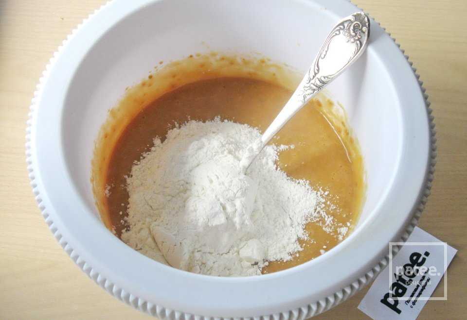 Добавить сахар, просеянную муку с разрыхлителем. Снова взбить миксером.