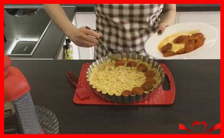 10. Налейте варенье на поверхность теста. Идеальное варенье — это густое смородиновое. Если варенье жидкое добавьте в него крахмал. На рисунке использовалось варенье из цельных абрикосов.