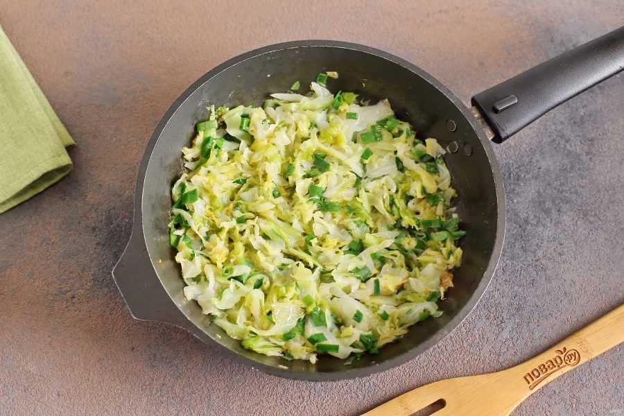 Для начала разогрейте в сковороде 1 ложку масла и выложите туда мелко нашинкованную капусту. Тушите на среднем огне до мягкости, периодически помешивая. Добавьте по вкусу соль, перец или другие специи. Снимите начинку с огня и остудите немного, добавьте измельченный зеленый лук.