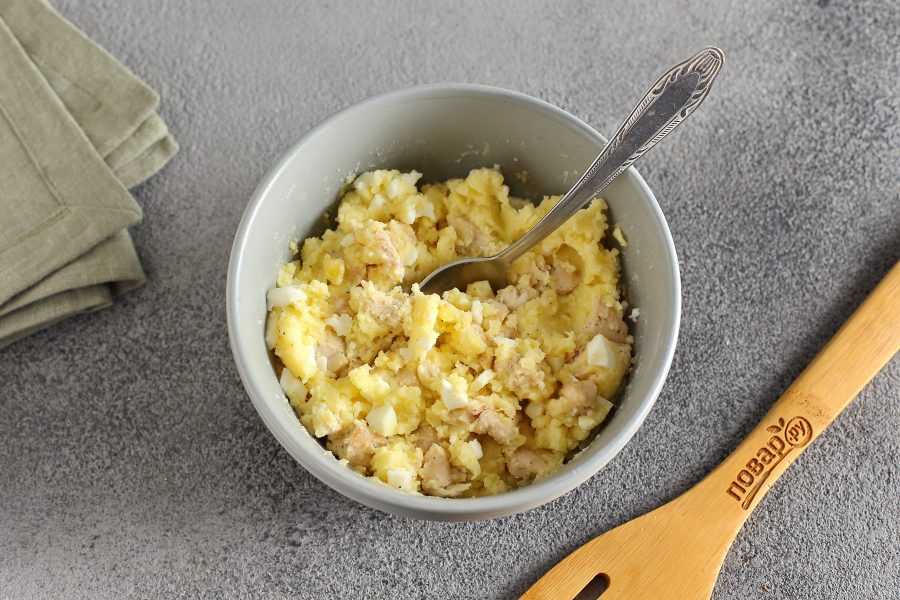 Для приготовления теста соедините сметану, майонез и кефир, добавьте взбитые яйца, муку и разрыхлитель, соль и взбейте до однородности. Куриное филе отварите в подсоленной воде до готовности или обжарьте на сковороде. Нарежьте филе небольшими кубиками. Измельчите отварные яйца. Соедините яйца с пюре, добавьте курицу, соль и специи по вкусу и аккуратно перемешайте.
