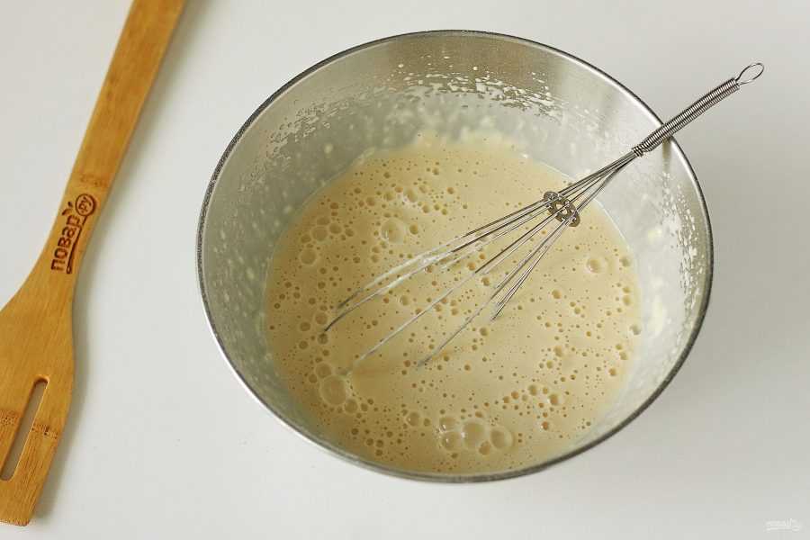Взбейте яйца с солью в глубокой миске, добавьте молоко, муку и соду.