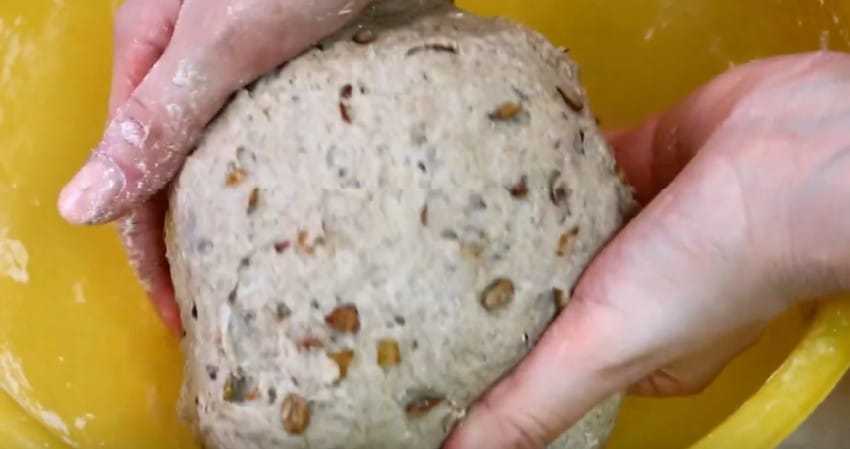 4. Добавьте обжаренный лук и семечки. Продолжайте вымешивать тесто: сначала ложкой, а затем руками. Сформируйте из теста шар, накройте полотенцем и оставьте в тёплом месте на час.