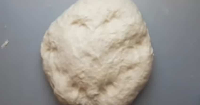 - Далее в поднявшиеся дрожжи, всыпаем нашу соленую муку и замешиваем сначала подручным инвентарем до однородности, а затем руками прямо в миске в течение 10 минут. Замешиваем тесто в шар, накрываем емкость пищевой полиэтиленовой пленкой или тканевым полотенцем и убираем в теплое место на 1,5 часа. За это время оно должно увеличиться в размерах примерно в 2 раза.