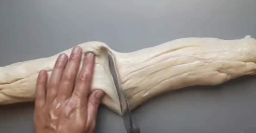 3. Выложите массу на стол. Смажьте руки маслом, скатайте тесто в длинную колбаску и разделите на равные части.