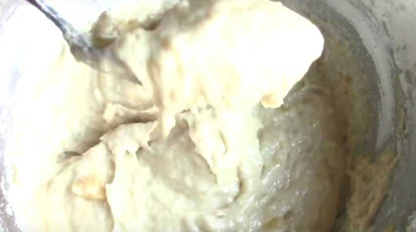 Когда опара начнет пениться, высыпьте в нее 2/3 муки, перемешайте. Накройте смесь пленкой, оставьте на час.