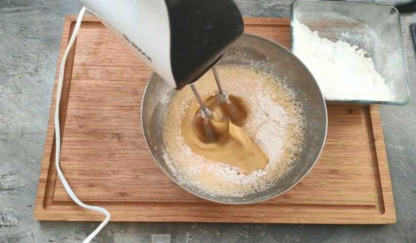 - Порционно просеять в миску с жидкими компонентами муку, перемешивая их миксером на низких скоростях. Дать постоять примерно 15 минут, периодически помешивая ложкой.