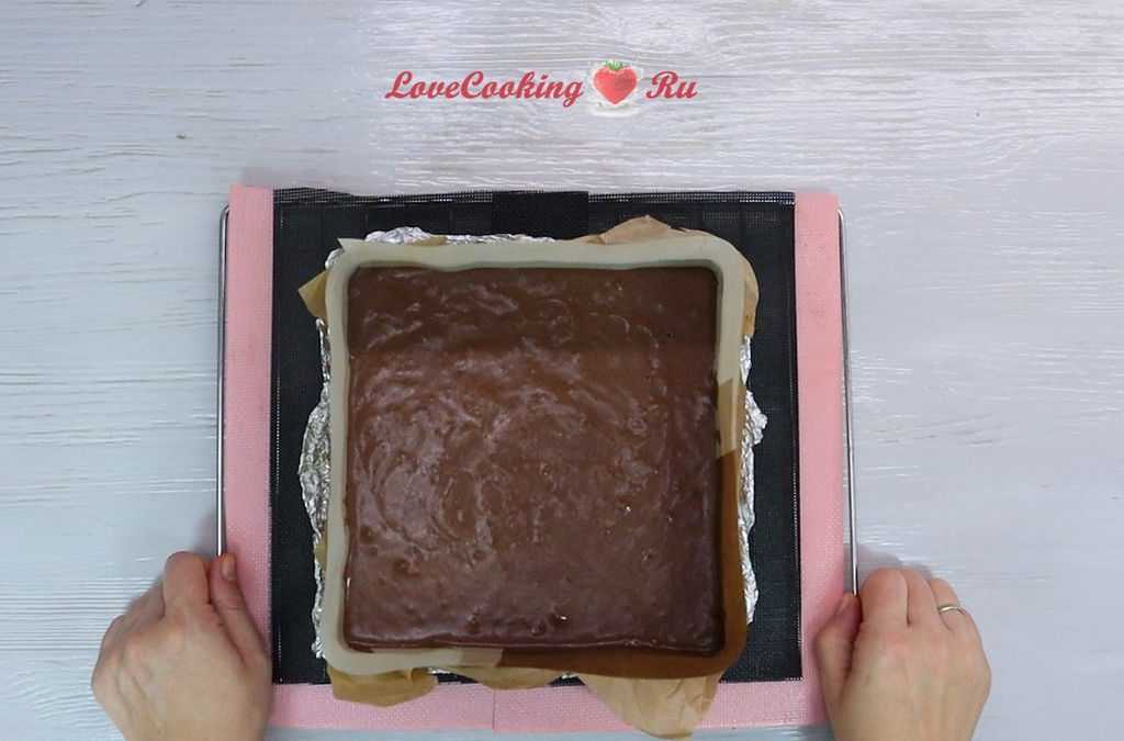 Выдержать в холодильнике ½ ч. Потом равномерно разровнять в форме, делая бортик, и выпекать при 180° 25-30 мин., остудить.