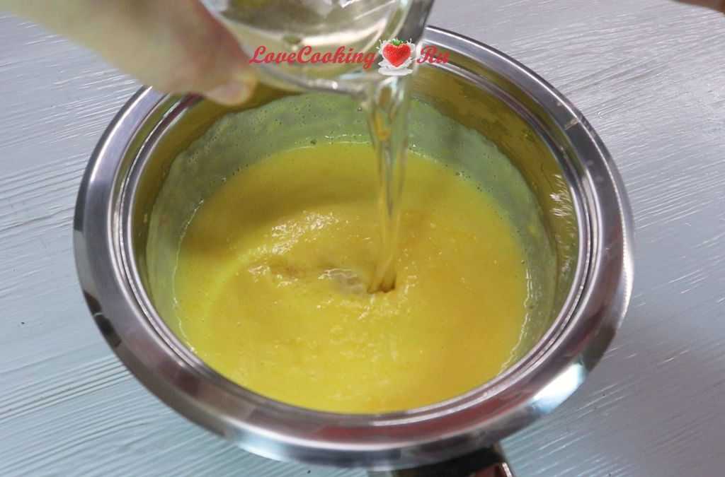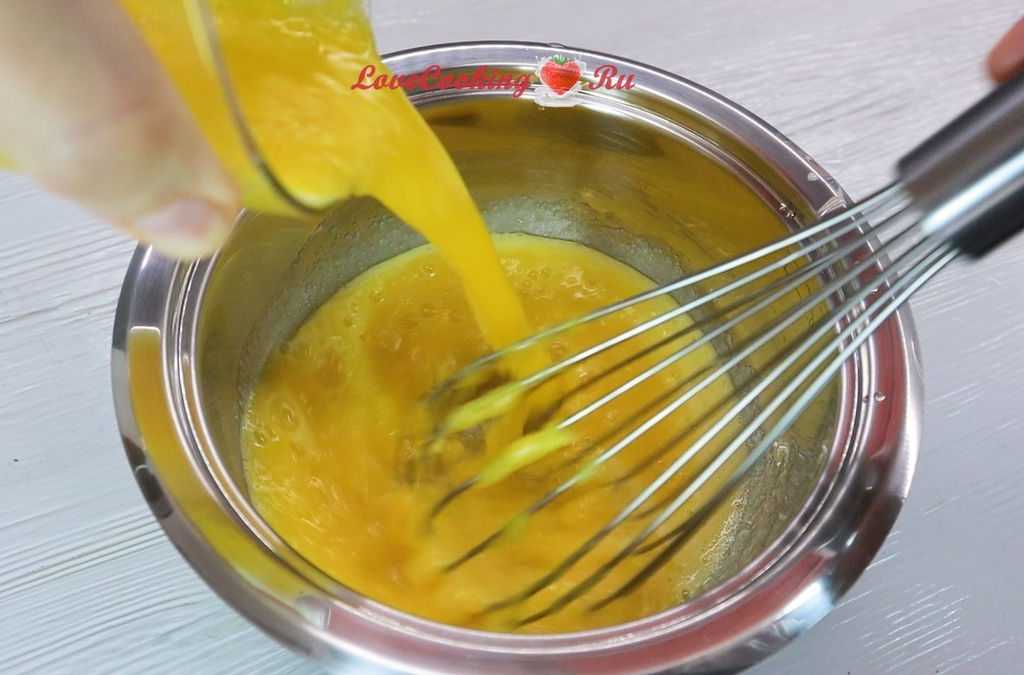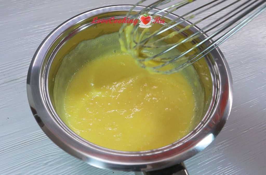 14. Сок с цедрой установите на огонь, не допустив закипания проварите. Присоедините взбитые яйца и варите, пока не загустеет, помешивая.