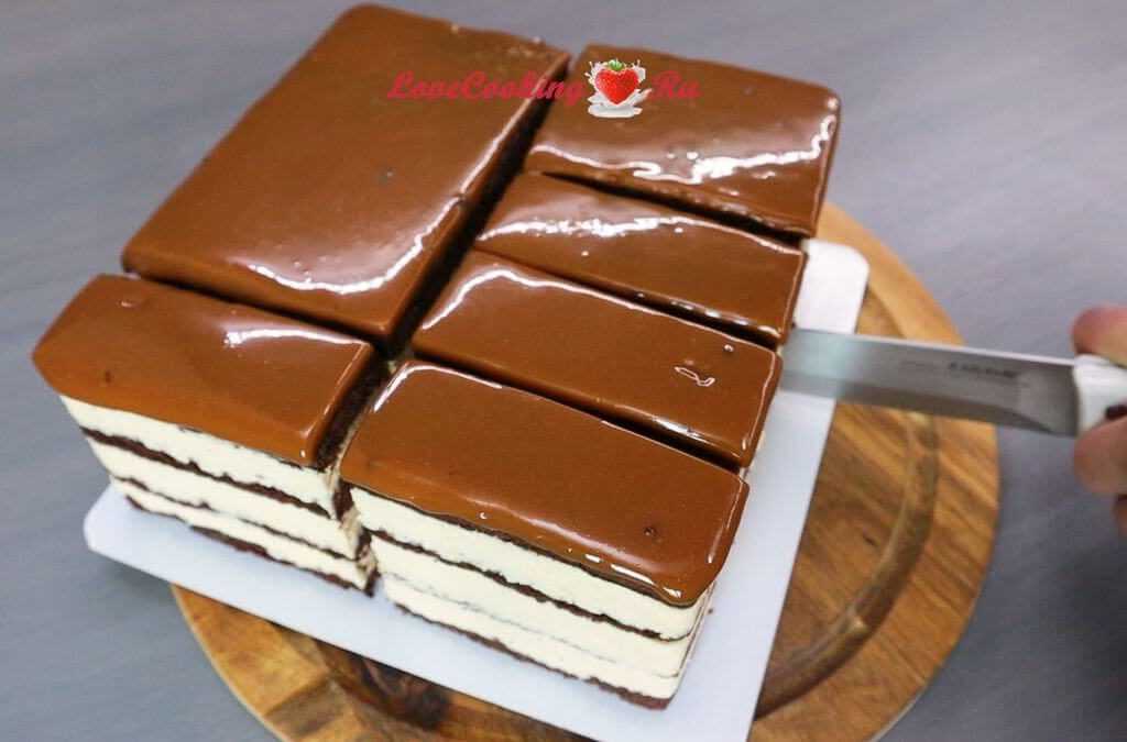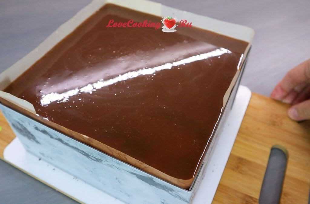 20. Третий пропитывать не нужно. На него налейте готовую глазурь, которую стоит приготовить перед использованием. Сделать это просто: поломайте шоколад на куски, нагрейте сливки и залейте ими сладость. Слегка остудите.