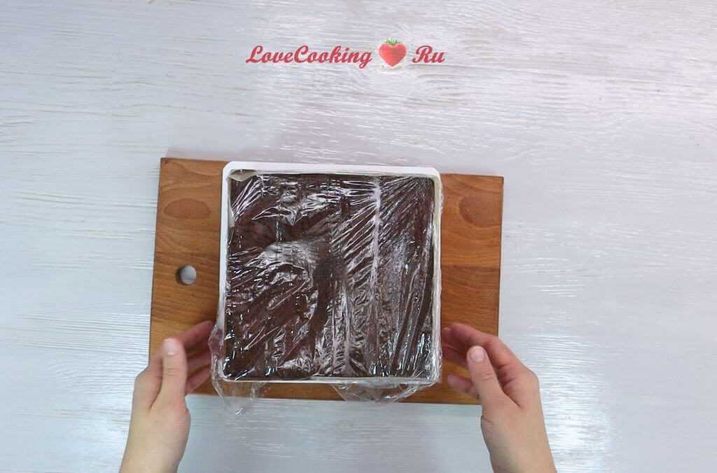 Положите шоколадный бисквит в форму. На него выкладывайте застывающий крем. Охладите торт.