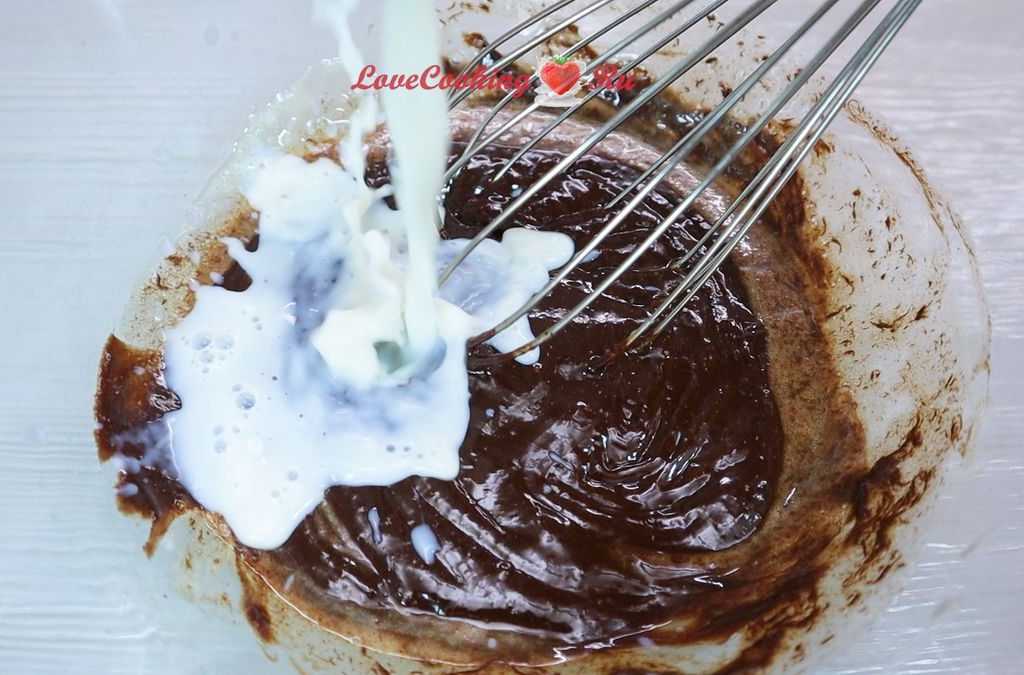 7. В несколько этапов введите муку с какао, уже ложкой осторожно перемешайте. 8. В практически готовое тесто по 2 ложки добавляйте готовые белки и завёртывающими движениями деревянной лопатки перемешайте