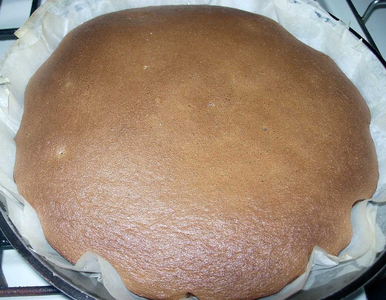 Форму для выпекания застилаем пергаментной бумагой. Выливаем в нее шоколадное бисквитное тесто. Отправляем его в заранее прогретую до 180° духовку на 40-50 минут.