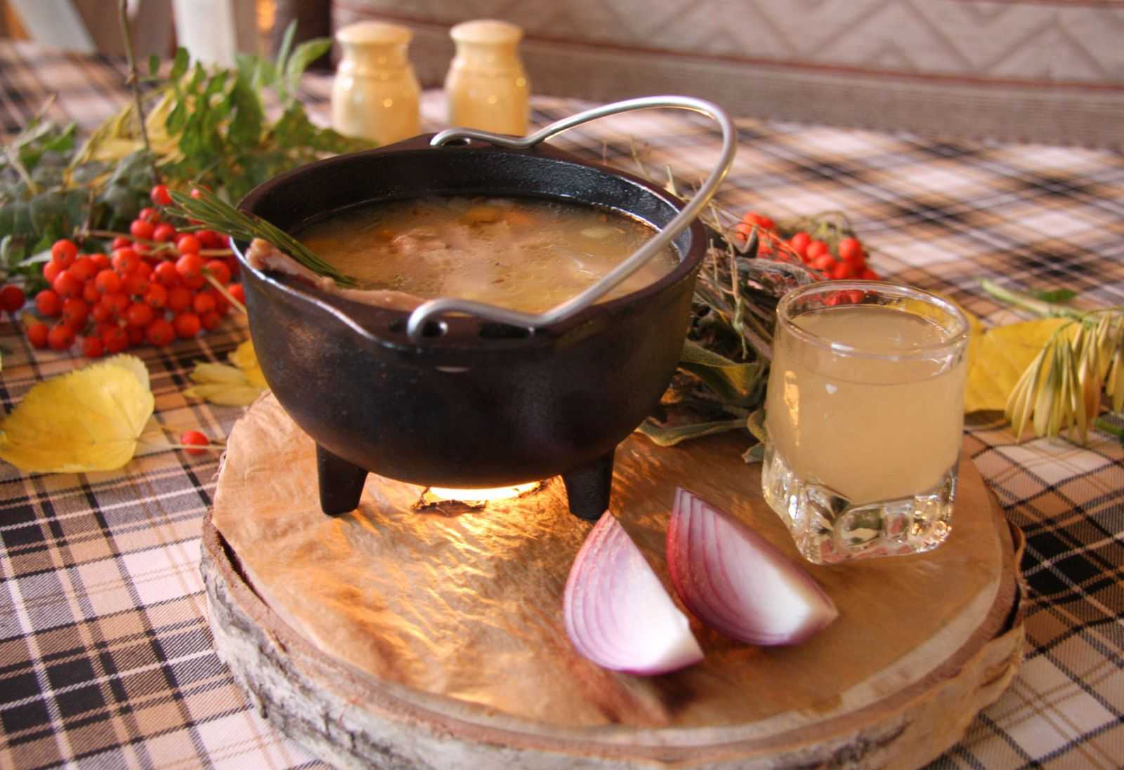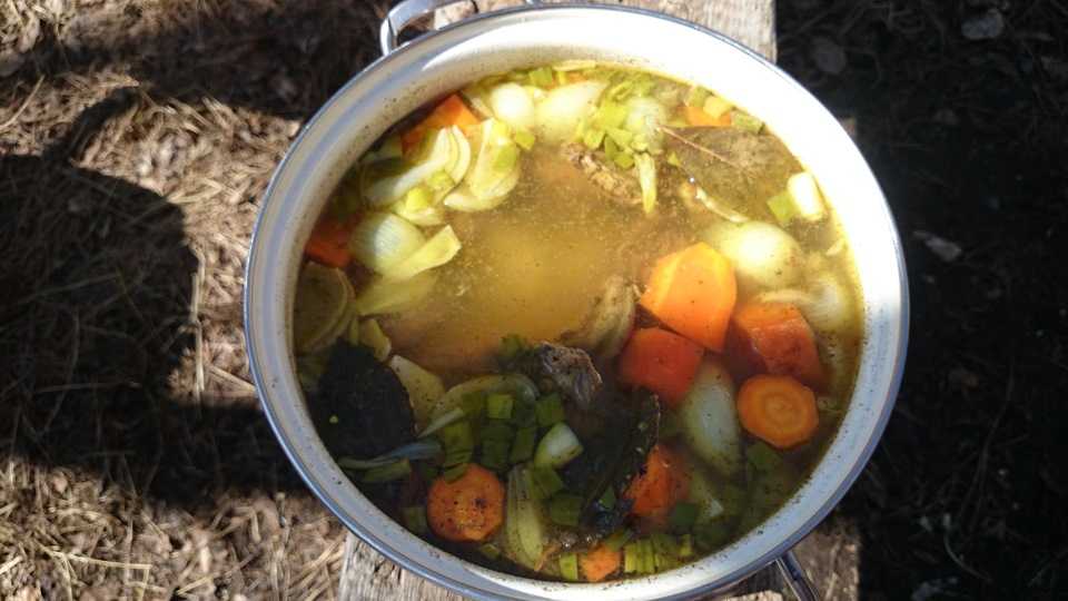 - Варите мясо с овощами около 30-45 минут, постоянно снимая пенку. Не подкидывайте в костер дров, чтобы бульон не выкипал.