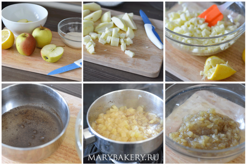- Пока тесто стоить в холодильник мы начинаем готовить яблочное компоте. Яблоки очищаем от кожуры и нарезаем одинаковыми небольшими кубиками, так они будут готовиться более равномерно. Яблоки нужно сбрызнуть лимонным соком, чтобы они не начали менять свой цвет.
