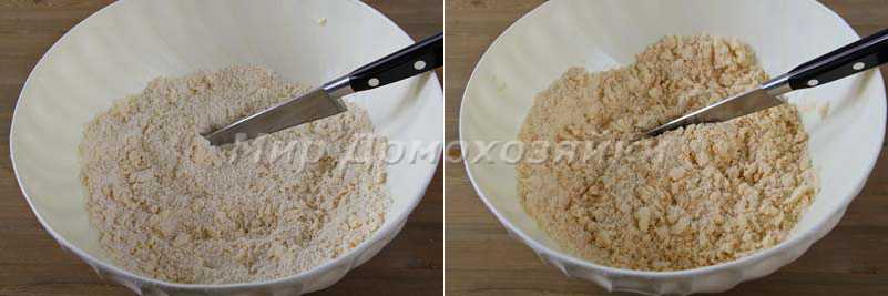 В просеянную муку кладем охлажденное сливочное масло и рубим его ножом до состояния крошки. Вбиваем желток и также рубим тесто в крошку, стараясь вмешать желток более равномерно.