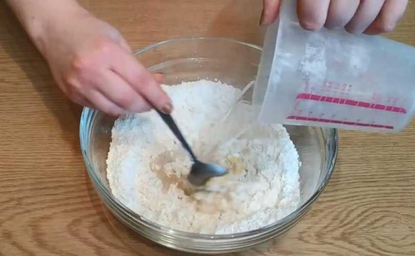 3.Налейте воду в муку. Все перемешайте ложкой или лопаткой.
