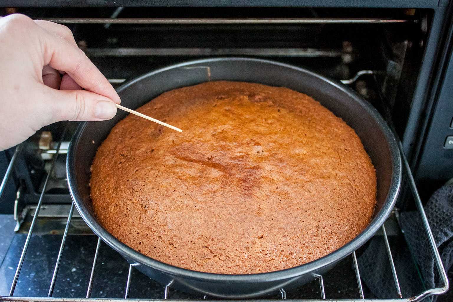 - Определить готовность коржей можно спичкой или деревянной шпажкой. Вынимать горячий бисквит из формы сразу нельзя, необходимо дать ему остыть в формочке минут 10-15.
