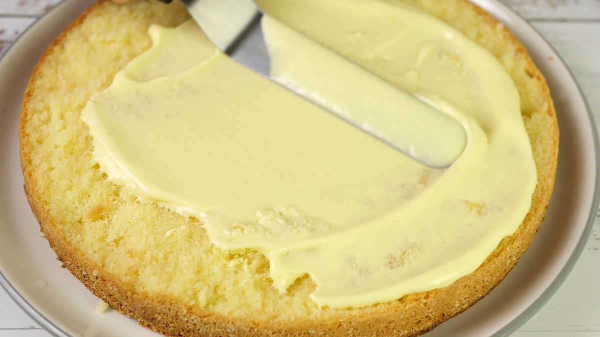 1. Возьмите готовый корж и смажьте его кремом. Затем положите второй и также всю поверхность пропитайте кремом, немного смажьте бока.