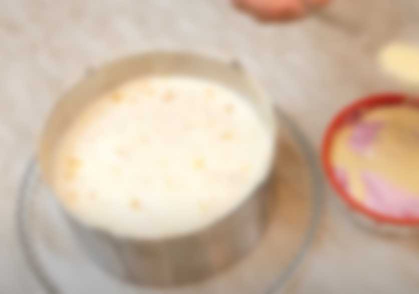На тарелку ставим кольцо, на дно кладем корж. В массу с кусочками цитруса вливаем третью часть распущенного желатина, перемешиваем. Выкладываем поверх коржа, хорошо разравниваем и убираем в прохладное место на 30 минут.