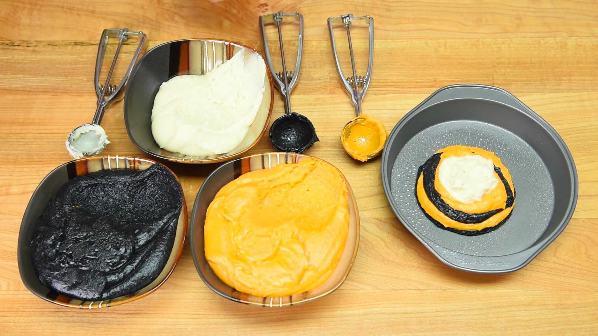 Тесто выкладываем небольшими порциями в 2 формы. Последовательность: черное, оранжевое, черное, оранжевое, белое и повторяем.