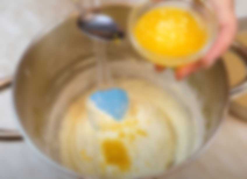 - В хорошо взбитые яйца в несколько приемов добавляем смешанную с разрыхлителем муку. Также в тесто добавляем цедру лимона и растопленное, но не горячее масло, аккуратно все перемешиваем.