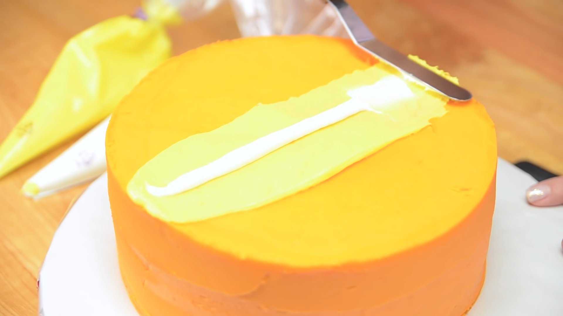 Желтым и белым кремами рисуем через центр торта полоску и растушевываем ее.