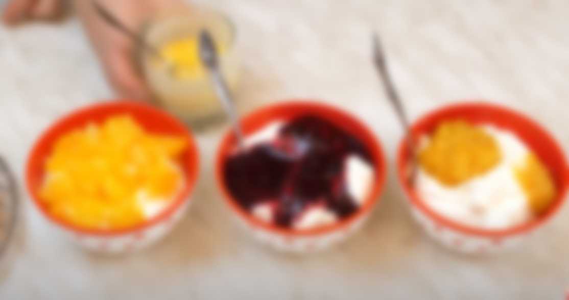 - Сливочно-творожную массу делим на 3 равные части. В одну добавляем апельсиновый джем, в другую – джем из черной смородины и в третью – кусочки мякоти апельсина. Все хорошо размешиваем.