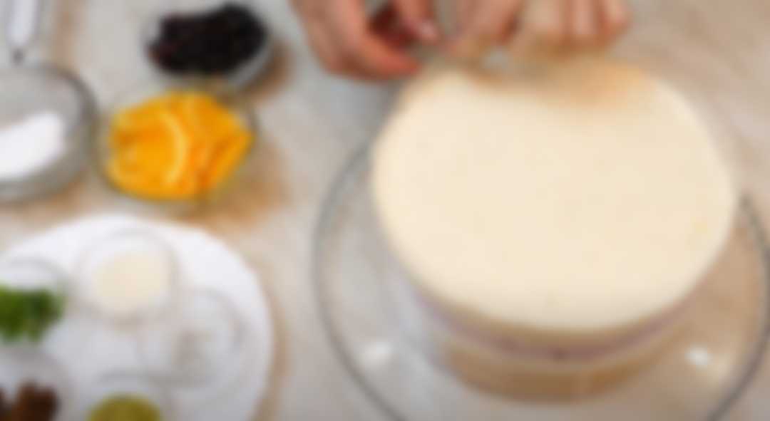 - Оставшийся желатин выливаем в массу с апельсиновым джемом, размешиваем и равномерно распределяем по поверхности торта. Возвращаем торт в холодное место до полного застывания на 5-6 часов.
