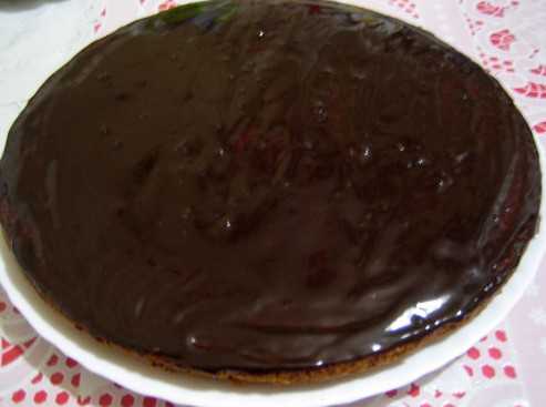 - Когда глазурь немного охладится, заливаем ею торт. Чтобы было красиво, шоколадная пелена должна захватить и бока кондитерской выпечки. Когда глазурь остынет, ставим торт в холодильник для полного загустения.