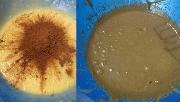 - Замесите жидкое тесто. Разделите продукт пополам, одну половину замиксуйте с какао.