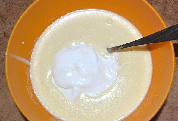 - Соедините сметану с остальными ингредиентами. Пищевую соду загасите посредством использования уксусной кислоты и отправьте в полученную смесь.