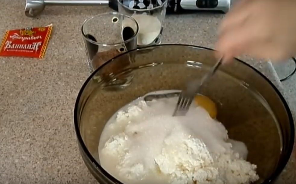 - Добавьте творог и муку, включите миксер либо снова перемешайте с помощью блендера все эти составляющие.