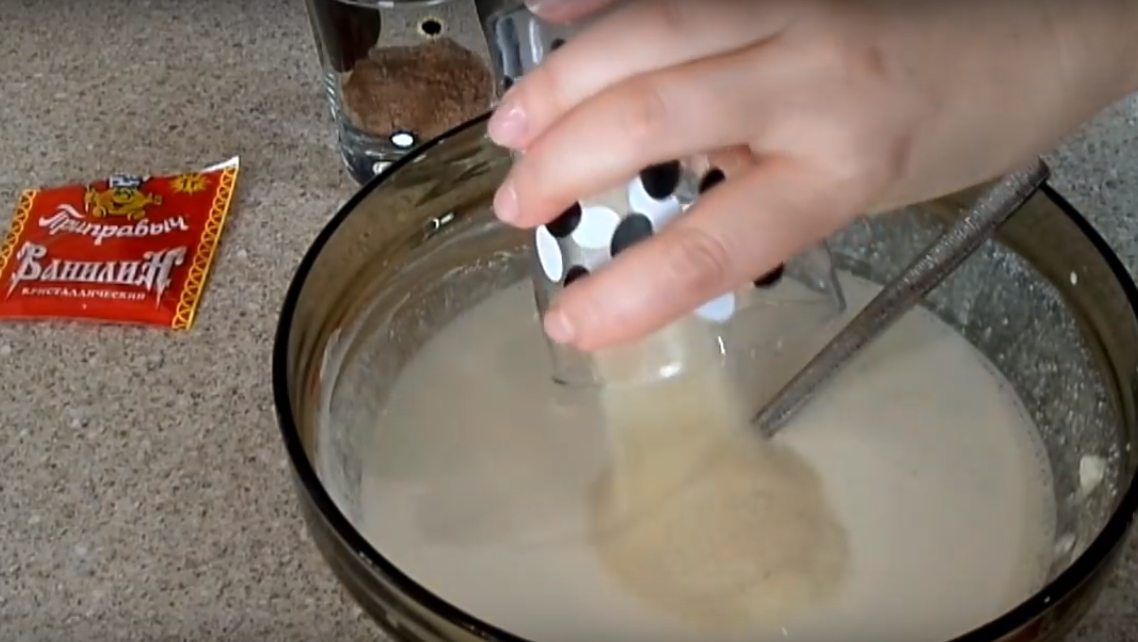 2.Добавьте в перебитый продукт все компоненты, кроме манки и разрыхлителя: немного соли, 100 гр. сахара, 50 гр. сливочного масла комнатной температуры, ванильный сахар (1 ч.л.), 50 гр. молока, 4 средних яйца.